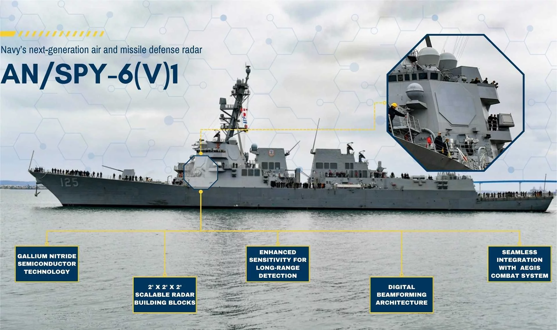 The AN/SPY-6(V)1 is a modular, active electronically scanned array (AESA) radar comprising four fixed faces, each built from 37 Radar Modular Assemblies (RMAs) based on Gallium Nitride (GaN) technology. It delivers 360-degree coverage with simultaneous air and ballistic missile defense, surface tracking, and electronic warfare resilience. This scalable design gives naval commanders faster decision-making and broader threat response capability across multiple domains.