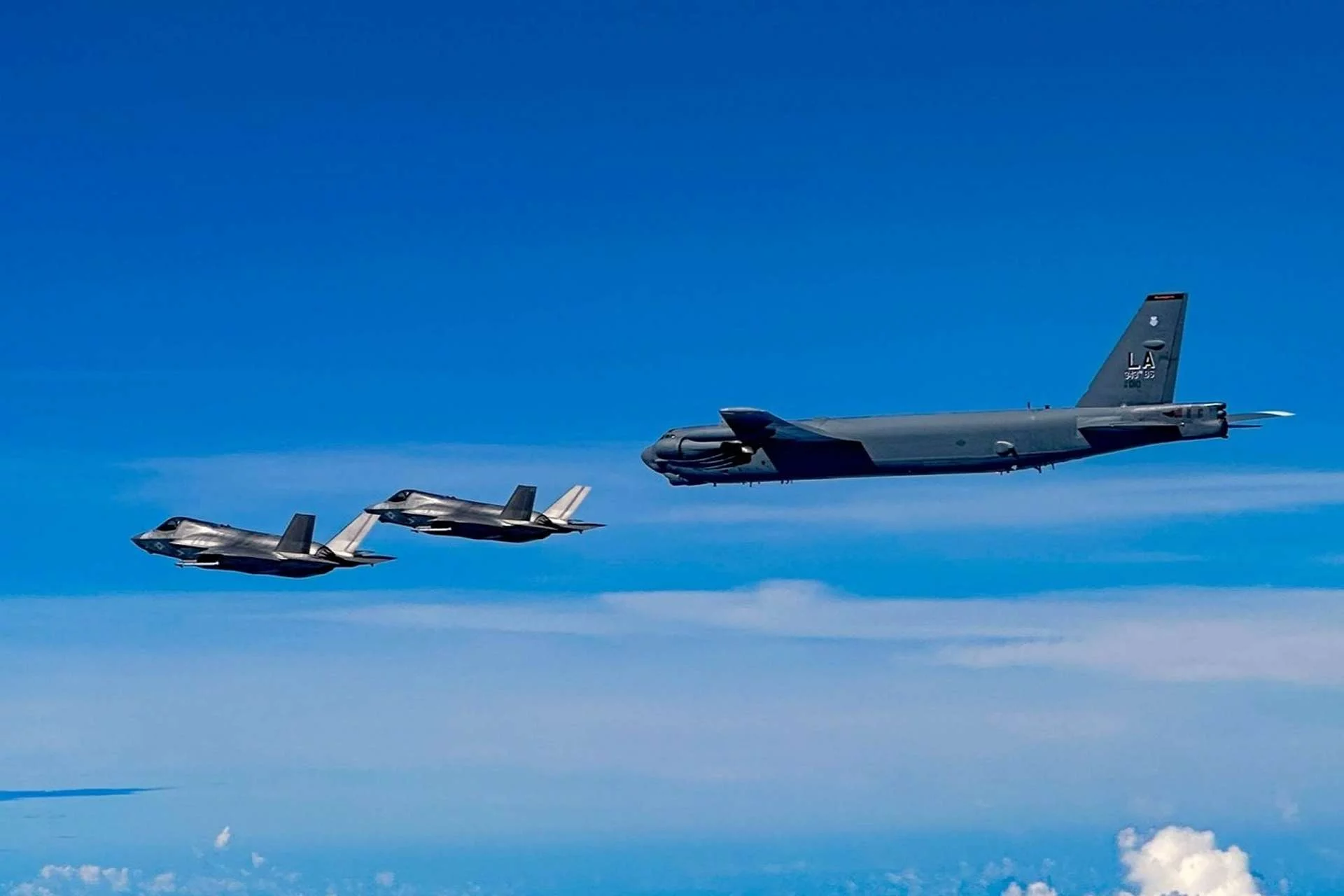 A U.S. Air Force B-52H Stratofortress and U.S. Marine Corps F-35B Lightning II fighters conducted a joint strike demonstration near Venezuela under U.S. Southern Command (SOUTHCOM). The mission highlighted America’s rapid power projection and deterrence capability amid growing foreign military presence in the Caribbean.