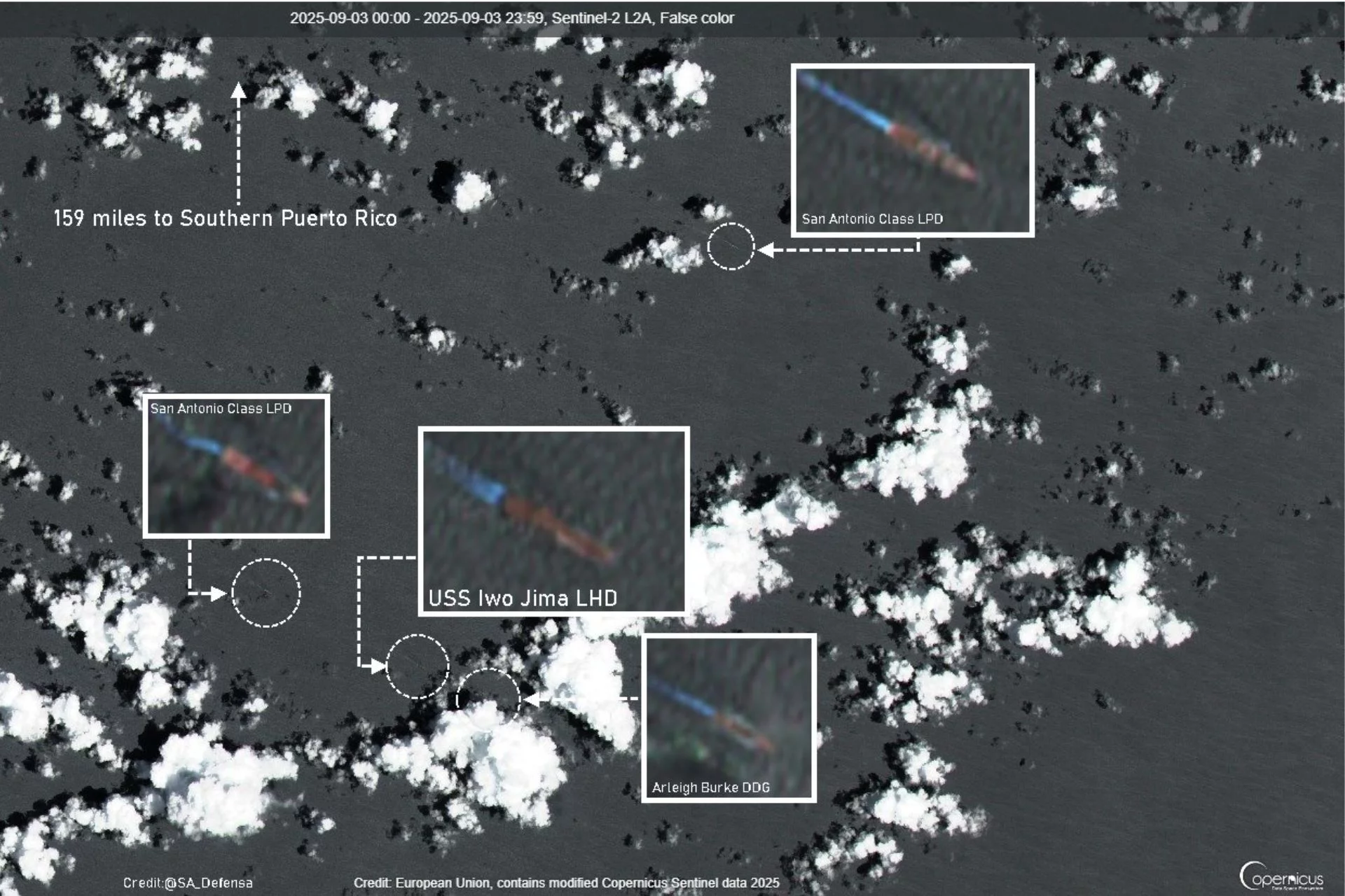 ESA Sentinel-2 satellite imagery confirmed that the USS Iwo Jima amphibious group transited the Caribbean Sea after exercises south of Puerto Rico, positioned approximately 550 km off the Venezuelan coast. The group is centered on the USS Iwo Jima (LHD 7) and includes two San Antonio-class amphibious transport docks and an Arleigh Burke-class guided-missile destroyer.